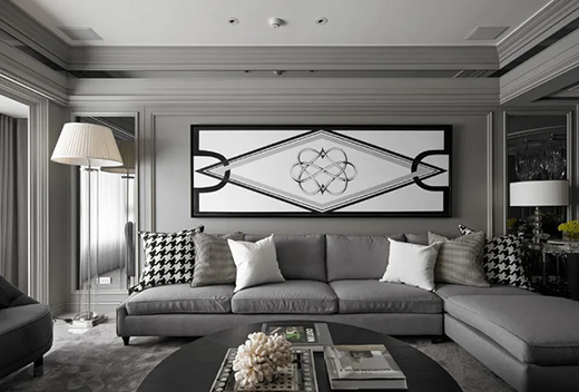 設(shè)計亮點:一幅超大的裝飾畫,詮釋了整個客廳的亮點,沙發(fā)背景墻還做了一些造型設(shè)計,與客廳吊頂相呼應(yīng)。整體色彩以灰色為主,使客廳空間的視覺延伸更寬廣。