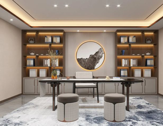 書房在一個(gè)獨(dú)立的空間中,兩側(cè)定制的柜子增加空間的收納,圓形的裝飾畫帶著燈帶的設(shè)計(jì),高級感與氛圍感都拉滿。