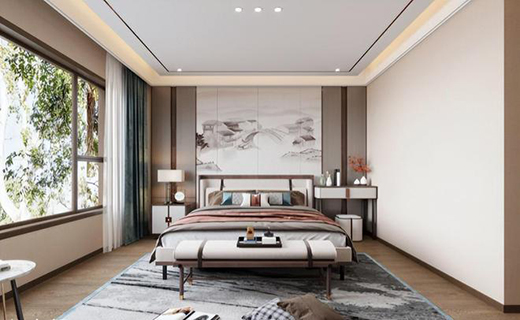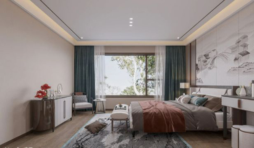 主臥的布置不講求個(gè)性,舒適與放松感是這個(gè)空間所追求的,中式的水墨裝飾的硬包床頭背景墻,搭配著頂部的燈帶設(shè)計(jì),營造出一個(gè)精致舒適的休息空間。
