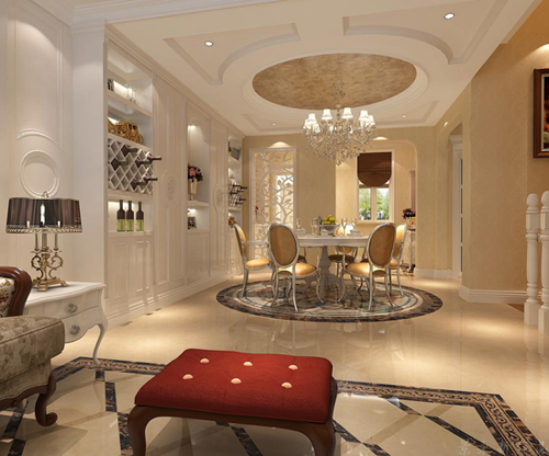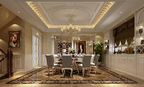 本案的設(shè)計(jì)風(fēng)格為奢華歐式風(fēng)格,餐廳典雅大氣,高貴華麗,具有濃厚的文化氣息。墨綠色的餐椅端莊又透著清新之風(fēng),這綠意又蔓延到桌上的插花、墻角的盆栽與墻上的掛畫上,設(shè)計(jì)師在細(xì)節(jié)上的用心可見一斑。吊燈造型古典別致,宛若一朵盛開的白蓮花,二樓欄桿以黑白配色,簡潔明了。整個(gè)空間呈軸對稱,讓視覺得到延展,舒適大方。