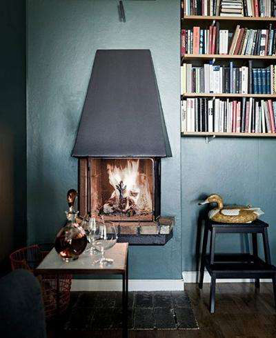 這是客廳的一個(gè)角落,暗藍(lán)色的墻面讓這個(gè)空間顯得很暗淡,但是壁爐和書柜的設(shè)計(jì)就讓這個(gè)小角落有了些許的文藝氣息,尤其是在冬天的午后,這個(gè)角落簡(jiǎn)直不要太舒適了,拿著一本書窩在壁爐前,溫暖又幸福。