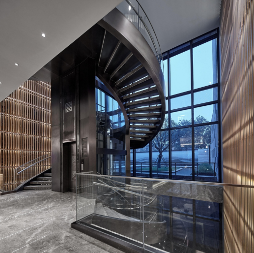 我們對這個建筑本身做了一些調(diào)整,玻璃的旋轉(zhuǎn)樓梯和戶外的光線,加上非常大的地面挑空讓采光井更寬大,讓地下室可以有更好的采光效果。地下室作為會所,這里面空間排布相對比較生硬,我們利用中間的圓廳將分開的部分做個結(jié)合。