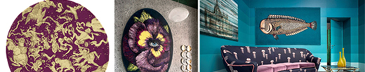 以巴洛克風(fēng)格為特色的著名意大利品牌Fornasetti,其古典與當代主題混合的產(chǎn)品中,Rug Emisfero Occidentale地毯將布朗紅與淺金黃色圖案相結(jié)合,Pensèe系列圓毯采用花朵形式結(jié)合布朗紅所屬的紫紅色相漸變配色,另一組展示中則以靚麗海藍色漸變墻面及掛毯搭配了深紫色、淺布朗紅圖案的沙發(fā),灰色石紋地面起到色彩中和作用,金屬玻璃桌上亮黃色玻璃瓶的加入,配合整體出現(xiàn)的趣味圖案,帶來一幅幽默復(fù)古而又藝術(shù)、充滿想象的家居組合畫面。簡潔精致的新復(fù)古風(fēng)格,無論是暗色調(diào)的整體還是突出趣味的表現(xiàn),幾何元素、黃銅金屬、玻璃、石材肌理、絨面材質(zhì)都是必不可少的元素,以純色為主的整體組合,相比圖案來說更為重要。