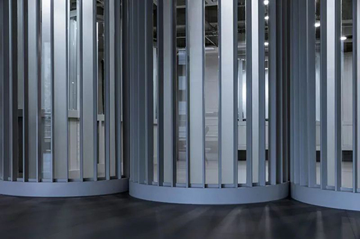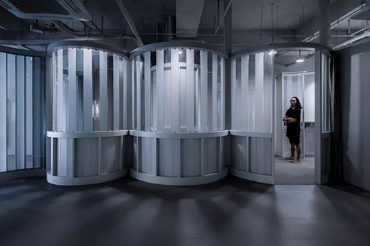 實(shí)際上,在舞蹈教學(xué)中,這種“觀賞”,自然地促進(jìn)了學(xué)員的學(xué)習(xí)動(dòng)力與表演熱情。成為優(yōu)秀的“展示者”,表達(dá)自己,用身體積極主動(dòng)地傳遞信息,這不正是舞蹈教學(xué)中非常重要的一部分么。身處“包間走廊”中的等待學(xué)習(xí)的學(xué)員,也在學(xué)習(xí)成為優(yōu)秀的“觀賞者”。正是這種表演與觀看的往來(lái),促成了教學(xué)中生動(dòng)的模擬,讓這個(gè)過(guò)程變得生動(dòng)、有趣。由此,環(huán)境中的“形象符號(hào)”也變得更有提示性的作用:整個(gè)裝置立面中全部采用了豎向的線條,讓人聯(lián)想到古典劇院中褶皺的幕布。