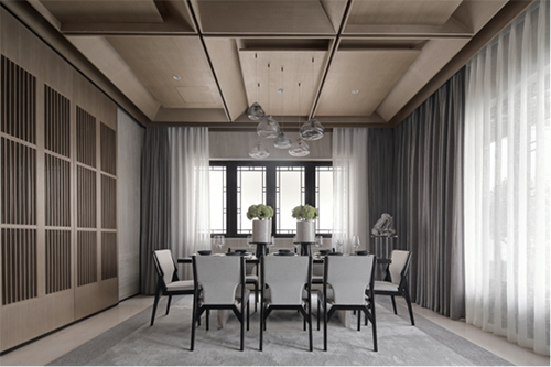 室內(nèi)公區(qū)天花吊頂造型簡(jiǎn)潔且呈立體陣列感,無(wú)中式符號(hào),卻顯出東方的莊重大氣,天花與墻面在色調(diào)上的呼應(yīng)統(tǒng)一,強(qiáng)化了空間在視覺(jué)上的延伸感。家具呈現(xiàn)結(jié)構(gòu)線條感,皮革材質(zhì)予人舒適與質(zhì)感;地毯選用加絲面料,更注重親膚觸感。