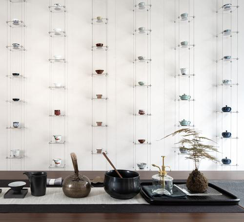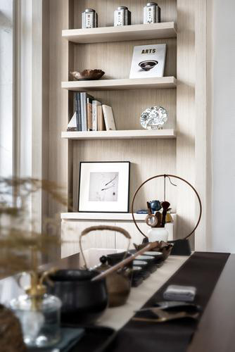 怡然自得的空間氛圍中,散逸著濃郁的人文氣息。設(shè)計(jì)師將幾十枚形制不一的杯盞陳列于一整面背景墻,精美的茶盞由此凸顯出獨(dú)到的藝術(shù)韻味,無用之美,在靜寂中流淌。