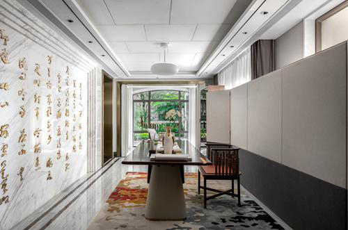 明亮的自然光照、古雅別致的圈椅、富有表現(xiàn)力的墻面鏤刻書法字,設(shè)計(jì)師在書法室這一隅空間中體現(xiàn)了許多不同尋常的室內(nèi)細(xì)節(jié),且讓每個(gè)元素和諧地兼容在一起。