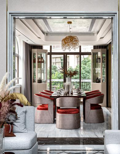 折衷美學(xué)講求比列均衡,注重形式美,設(shè)計(jì)師將這種特質(zhì)于餐廳空間中加以重點(diǎn)呈現(xiàn)。整體空間涵容著一種閑適的自信、沉淀著優(yōu)雅的韻致,墻面板與裝飾畫的搭配保留了一絲古典的豐神情韻,紅色靠椅搭配流光溢彩的餐桌和西式餐具,演繹日常生活的豐瞻之美。