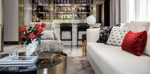 負(fù)一層會客廳整體通透大氣,品質(zhì)感的家具擺設(shè)與硬裝搭配得天衣無縫,設(shè)計(jì)師希望借由簡約而不簡單的組合,讓優(yōu)雅格調(diào)和氣質(zhì)美感彰顯于空間各處細(xì)節(jié)。方正的空間中,圓弧形巧妙置入,讓品味空間多了一絲柔軟,一抹鮮紅則綻放著生活的熱情,于不經(jīng)意間流溢出不凡品味。