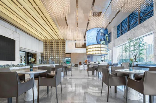 在大堂的構(gòu)造中,自由開(kāi)放的臺(tái)面布局,呼應(yīng)了人們對(duì)于自由美好的生活向往,視覺(jué)上開(kāi)闊明亮,營(yíng)造出自然、動(dòng)態(tài)的效果,超越了時(shí)空的特質(zhì),從中孕育出更為動(dòng)人的魅力。
