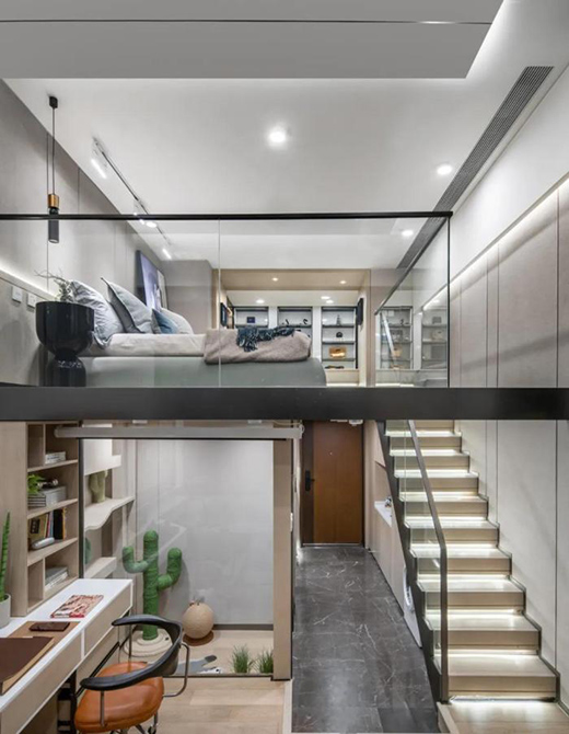 loft是如今頗受青年人喜歡的的商業(yè)公寓格局,面積雖不大,卻能提供靈動(dòng)豐富的生活空間,功能分區(qū)井井有條。一層是工作、社交區(qū),足以滿(mǎn)足日常生活所需,二層則是私人空間,提供溫馨舒適的睡眠空間。經(jīng)典的黑色,搭配原木色與白色,看起來(lái)既簡(jiǎn)潔又大方,同時(shí)形成框景效果,景深感加強(qiáng),給人極佳的視覺(jué)體驗(yàn)。