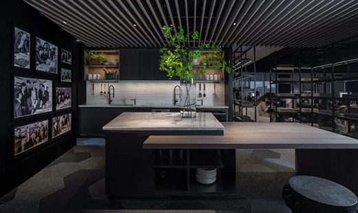 咖啡吧另一側(cè)的開放式廚房,將東方飲食禮儀納入其中,廚房中島可供吧臺小酌或冷餐用餐的情境設(shè)定,滿足不同的需求,展現(xiàn)空間的多元性。