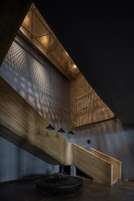 設(shè)計(jì)以竹子不同的肌理紋理來表現(xiàn)空間。房間內(nèi)用竹片、竹片、竹皮三種不同的材質(zhì)構(gòu)成了拱形的竹編,形成了每個(gè)空間獨(dú)特的表皮。同時(shí),以原竹構(gòu)筑過道頂面,追求一種時(shí)空“錯(cuò)亂”。大廳樓梯間以竹編造型,燈光將光線投射到墻壁上,營(yíng)造一種宛如竹海中破碎陽光的景象。
