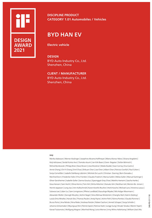 4月13日,2021德國iF設(shè)計獎結(jié)果揭曉,在參與評選的近一萬個作品中,比亞迪漢EV脫穎而出,榮登產(chǎn)品設(shè)計類獲獎榜單,成為中國品牌首款獲獎轎車車型。
