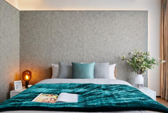 書房、主臥、衣帽間、衛(wèi)浴共同組成獨(dú)立的大套間,私享靜謐空間由此開啟。主臥立面墻布延伸至頂面一體化呈現(xiàn),藉此拉升豎向高度,下方同色系木格柵創(chuàng)造出橫向序列感,讓造型獨(dú)特的主臥更添藝術(shù)美感。