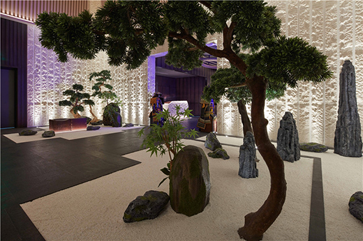 進(jìn)而為凸顯質(zhì)樸的自然屬性,接待處以天然石作為接待臺(tái),在日本古代的平民客廳中,以『圍爐里』為主光源,燃燒不熄, 故有生生不息之意。