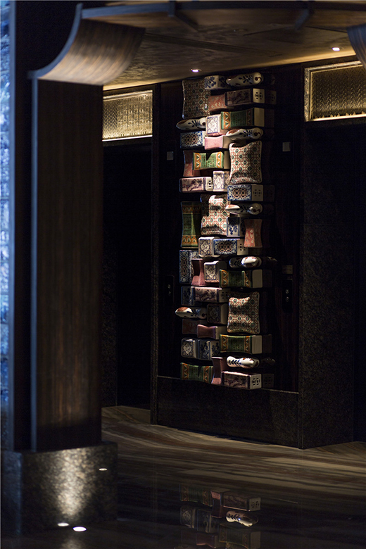 此時(shí)讓我們把這出電影的鏡頭切到特色客房部?!澳タ虨檎?以備暑月之用”,電梯門徐徐打開,設(shè)計(jì)師用不同形狀和顏色的傳統(tǒng)中式石枕作為墻飾,幽默而溫暖地提醒來客:您即將進(jìn)入睡眠區(qū)!趣哉。