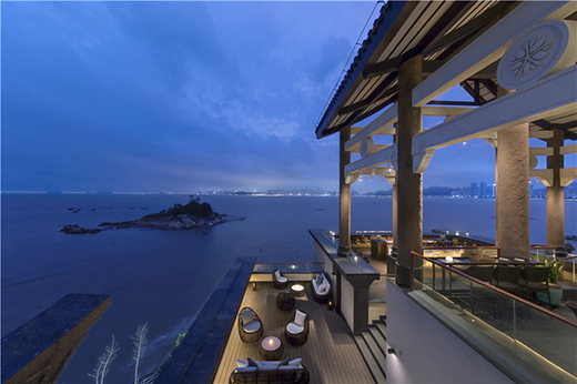 一對(duì)銅制的鳳凰飛舞在酒店大堂空中。設(shè)計(jì)師用紅銅打造風(fēng),用青銅制成凰,在偌大的空間上無聲上演一出琴瑟調(diào)和的鳳求凰。電影的鏡頭回落到窗外的大海,便能發(fā)現(xiàn)靜立在大堂中央的黃石。在珠海情侶路的海邊上,這種黃石甚是常見,在海浪不斷沖刷之下底部會(huì)生成或深或淺的青苔。