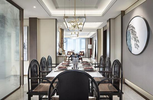 淡雅的灰調(diào)與干凈的白色,平衡著餐廳的美學(xué)氛圍,淺淡的設(shè)色令空間氣質(zhì)安靜而輕盈。留白的藝術(shù)裝置與水彩抽象掛畫形成強(qiáng)烈對(duì)比,在鏤空燈籠狀的綠色燈飾點(diǎn)染下,意境氤氳而柔和,空間中仿佛彌漫著一曲清音妙樂。
