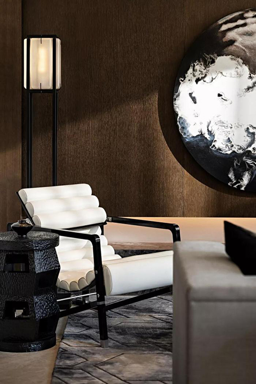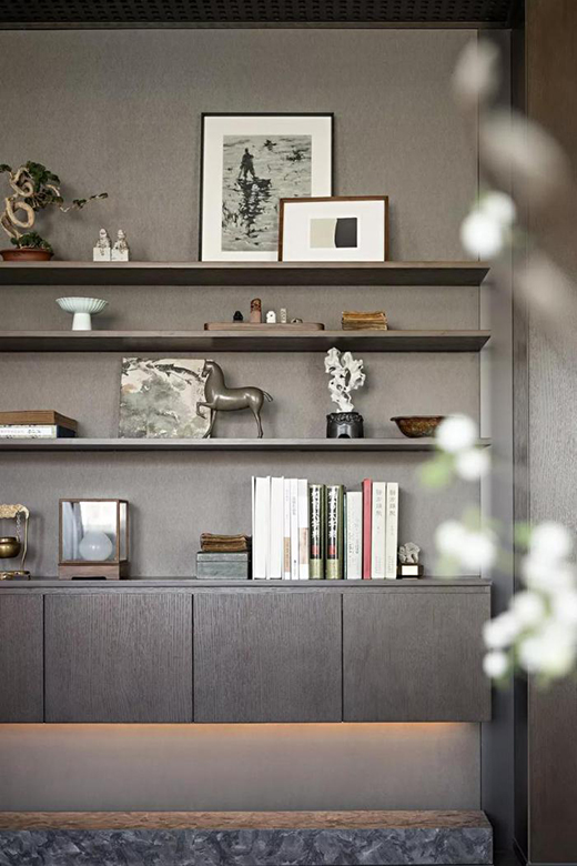 “畫類萬物之情。”蒼勁筆鋒象征著文人不屈不撓的傲骨,是歲月贈(zèng)予的穩(wěn)重與柔和,幽潤(rùn)昏暗的燈光,內(nèi)斂秀美的家具形態(tài),含蓄溫和的材質(zhì)對(duì)比將這一切不自覺中帶入一種優(yōu)雅當(dāng)中。情景交融、聲情并茂、虛實(shí)相生、讓人感受到無盡的意境之美。