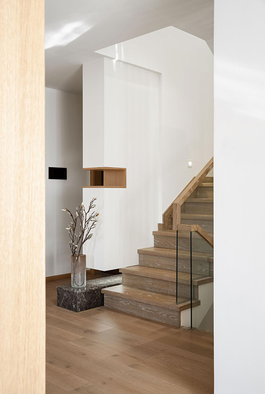 如果在現(xiàn)代聯(lián)排別墅中加入一個佛堂,會顯得既突兀又不實用。一個嵌入式佛龕,既表達(dá)了虔誠之心,又豐富了立面的材質(zhì)細(xì)節(jié),可謂巧思。小中見大,打開玻璃門就可以誠心禮佛。