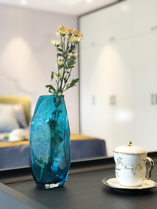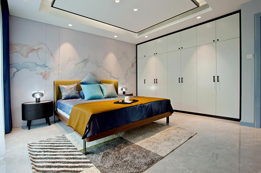 客廳同款背景墻與簡(jiǎn)潔的吊頂造型線條感極強(qiáng),拉伸著空間的維度,不同明度的藍(lán)色軟裝讓人陷于靜謐的藝術(shù)中,營(yíng)造出平和舒適的睡眠空間,瞬間忘記了時(shí)間。如果說光影成就了空間的藝術(shù)感,那么藝術(shù)本身則豐富了空間的格調(diào)。