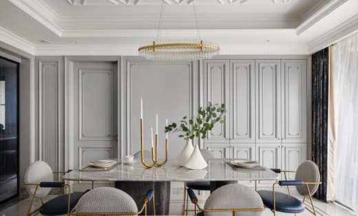 餐廳空間延續(xù)客廳的格調,在法式墻面的背景墻下,通過強化線條的形式,來體現(xiàn)空間的現(xiàn)代時尚感。長形餐桌與墻面壁紙的融入,形成了舒適休閑的用餐空間。