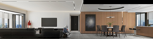 為了使室內(nèi)看起來更具舒適性,設(shè)計(jì)師使用了嚴(yán)格的幾何輪廓與黑白對比,同時(shí)增加了自然木色,結(jié)合細(xì)致的燈光設(shè)計(jì),用光線的布局變化來營造室內(nèi)氛圍。