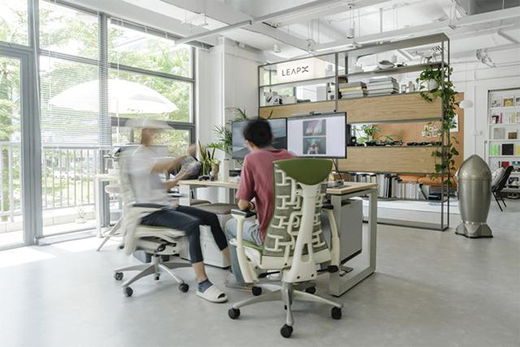 善待設(shè)計師,是鄧雨眠成立 LEAPX 首先做的事情,從一開始,鄧雨眠就希望 LEAPX 的所有人都處在一個尖端的設(shè)計環(huán)境中,所以他花了很多心思在工作室的打造上。比如會客區(qū)的沙發(fā)是來自北歐的 Muuto,臺燈來自 Dyson,人體工學(xué)椅來自 Herman Miller……