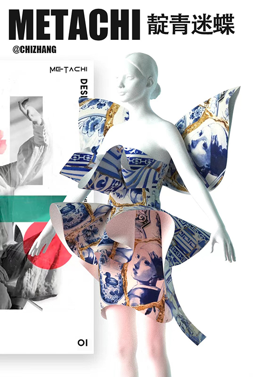 “靛青迷蝶”讓虛擬時(shí)裝中的蝴蝶再一次破繭而出。借青花紋飾刻畫、堆砌蝴蝶的靈動與靈魂不朽與純凈,“靛青迷蝶”以全新的語境表達(dá)的藝術(shù)歌頌自然與生命,不斷探求生命根源中更具意義的基因和精神元素,放大重組,深化作品的表現(xiàn)力和內(nèi)涵。