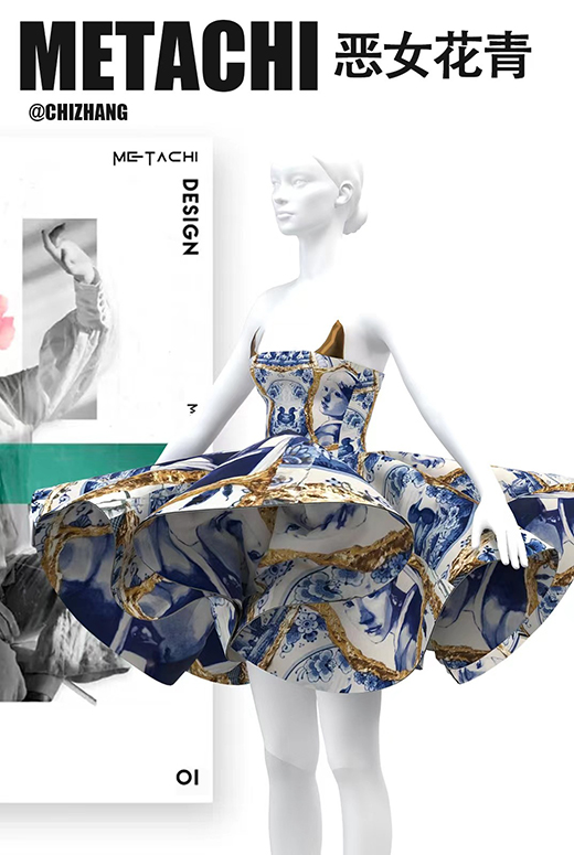 雖然“數(shù)字時(shí)裝”“虛擬時(shí)裝”“虛擬時(shí)尚”等諸多理念是伴隨著“元宇宙”的興起而進(jìn)入公眾的視野。但作為中國時(shí)尚界的翹楚,一直秉持著“環(huán)?!痹瓌t的張馳,早在2018年至2019年海洋危機(jī)期間即萌生了“虛擬時(shí)尚”的概念,并由此創(chuàng)立METACHI數(shù)字時(shí)裝品牌。數(shù)年深耕的積淀,到雨后春筍般崛起的虛擬時(shí)裝作品,也讓張馳和METACHI在虛擬時(shí)尚領(lǐng)域名聲大噪,成為了中國乃至世界范圍內(nèi)的權(quán)威代表;從最初的“最終幻想”系列虛擬時(shí)裝作品,到“青夢靈蝶”、“三生宇宙”,再到此次發(fā)布的作品“只此青花濃”,張馳每一次所帶來的作品不僅驚艷,也對虛擬時(shí)尚的理念發(fā)起了詮釋和沖擊。