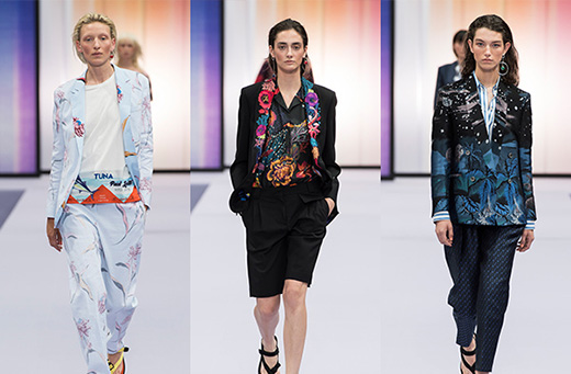 傳統(tǒng)英式西裝布料于本季回歸,包括格紋和千鳥格紋面料,在時(shí)裝秀上與鮮艷印花和奪目色彩互相輝映。熱帶花卉圖案采用反面印花設(shè)計(jì)在西裝外側(cè),圖案猶如經(jīng)過日曬褪色,帶來夏日休閑沖浪氣息。