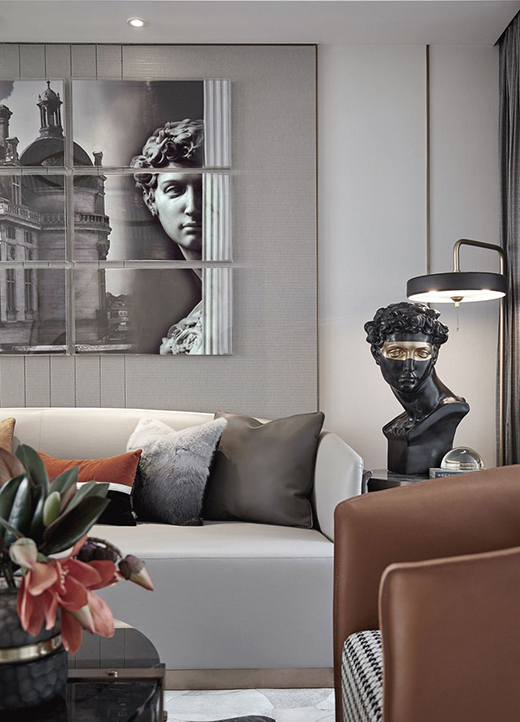 本案設(shè)計(jì)師對現(xiàn)代空間的美學(xué)思考,將上世紀(jì)的雕像融合現(xiàn)代藝術(shù),匯融出獨(dú)具一格充滿西方氣息的藝術(shù)空間??蛷d以米白色與灰色作為主色調(diào),神秘感縈繞其中,橙色的皮具單椅搭配千鳥格紋理的坐墊,大衛(wèi)雕像元素的介入,一種新舊西方文化的碰撞, 和諧而統(tǒng)一,重新定義古典藝術(shù)與現(xiàn)代空間的表現(xiàn)形式。