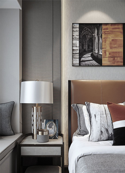 “品味,像清風(fēng)拂動(dòng),像月光揮灑,你只能感受它的存在,卻難以真切地描述它。”主臥是彰顯主人品味的空間,延續(xù)客廳的風(fēng)格特點(diǎn),以灰色和米白作為主色調(diào),以橙色點(diǎn)綴。背景墻上的一尊裝飾物,線與面的錯(cuò)綜交織,主臥中的氛圍似乎有了律動(dòng)的生機(jī),品質(zhì)上乘的床品與軟飾,突出了主人對于休憩空間的舒適度的追求,更是對生活哲學(xué)的理解。