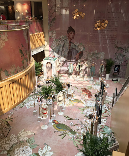 胭脂用盡的三月,桃花開(kāi)了。靘將整個(gè)負(fù)二樓中庭用“延禧紅”覆蓋。從天到地全是品牌2019年的洛神驚鴻系列印花圖案,磚粉背景里的藝術(shù)印花,靈感來(lái)源于20世紀(jì)初歐洲的新藝術(shù)運(yùn)動(dòng)植物裝飾畫,配合宋朝的動(dòng)物寫真風(fēng)格,跨越中西千年的組合竟然默契不已,充分體現(xiàn)了摩登古典主義的美學(xué)主張。