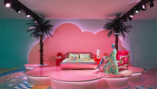 Bikoff 將為是次展覽創(chuàng)作藝術(shù)裝置場(chǎng)景,展示 Versace Home 系列的新品。其設(shè)計(jì)以 Richard Avedon 為 Versace 1994年秋冬廣告系列為創(chuàng)作藍(lán)本,建構(gòu)出連系 Versace 時(shí)裝與 Home 系列的橋梁。品牌的經(jīng)典圖案化身儼如棒棒糖的漩渦圖案地毯,熒光色的浮云和島嶼,為天馬行空的奇幻世界畫龍點(diǎn)睛。此外, Bikoff 更特別設(shè)計(jì)多個(gè)獨(dú)立場(chǎng)景,烘托品牌將經(jīng)典復(fù)刻并重新演繹的 Versace Home 系列,以玩味的手法向 Versace 圖案和素材致敬。她同時(shí)為 Versace 米蘭專門店及 Versace Home 家品店設(shè)計(jì)廚窗。