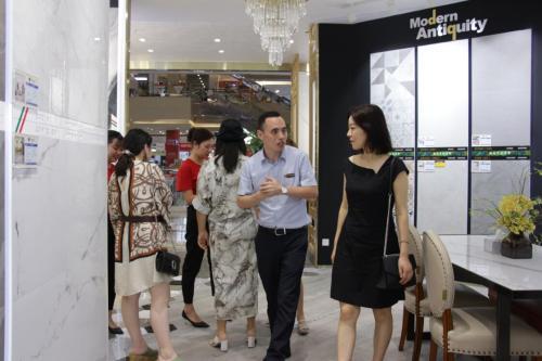 在羅馬利奧瓷磚體驗(yàn)店,設(shè)計(jì)團(tuán)在門店工作人員帶領(lǐng)下參觀了解