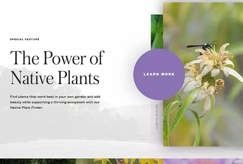Mt. Cuba Center:植物識(shí)別網(wǎng)站使用懸停Buttons設(shè)計(jì),圖形和顏色幾乎跳出屏幕。配合有趣迷人的Buttons交互動(dòng)效,你能不點(diǎn)擊嗎?(幾乎所有的圖像是一個(gè)鏈接)Buttons在設(shè)計(jì)中采用大圓形、紫色、扁平化設(shè)計(jì),如下圖所示。什么是特別好的圓形Buttons,一眼看上去就知道它是一個(gè)Buttons。因?yàn)樗侨绱酥?,你?huì)猜測是否是Buttons,但懸停狀態(tài)的顯示方式讓用戶想跟它互動(dòng)的沖動(dòng)。這是出發(fā)用戶互動(dòng)的樂趣。