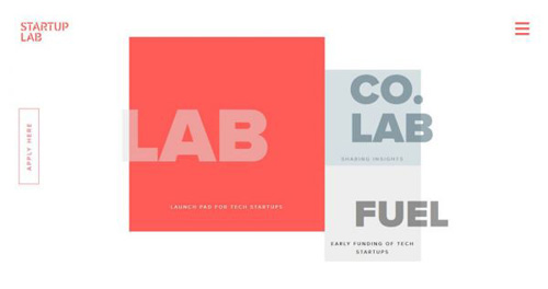上方 Startup Lab 的網(wǎng)站就將色塊和文本以極其時尚的方式搭配起來,文字橫跨白色的背景和不同的色塊,合理的色彩對比讓整個視覺顯得微妙又舒服。