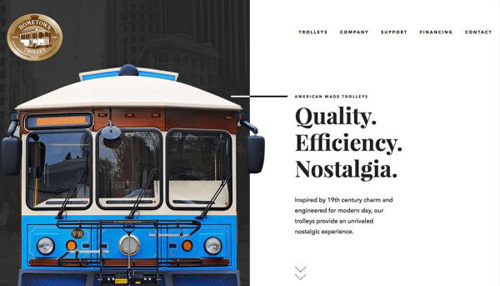 許多跨區(qū)域的排版設(shè)計都非常明顯,但是也有比較微妙的,比如上面的網(wǎng)頁 Hometown Trolley 。右側(cè)文本部分伸出一條線,將用戶視覺引導(dǎo)到左側(cè)的圖像當(dāng)中,如果你仔細觀察,還會發(fā)現(xiàn)左邊汽車的后視鏡從背景中突出并延伸到右側(cè)的文本區(qū)塊當(dāng)中來。