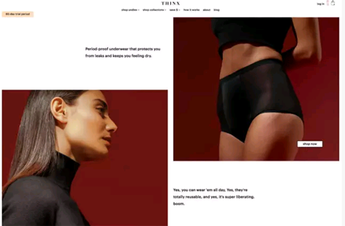 Thinx這個案例我非常喜歡,并且經(jīng)常會用到,因為它證明了設計師并不一定非得靠高飽和度的霓虹色來創(chuàng)造高對比度的配色。即使是兩種平衡的顏色,也能讓整個設計脫穎而出。