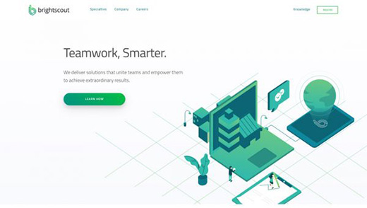 Brightscout 這個(gè)網(wǎng)站的首屏采用了微妙有趣的對(duì)角線式的布局。圖片和文字說(shuō)明錯(cuò)落地分布在網(wǎng)站當(dāng)中,這種錯(cuò)落而整齊的布局給人的感覺(jué)也頗為開(kāi)放,滾動(dòng)的過(guò)程中,縮放式的動(dòng)效會(huì)讓人忍不住不停滾動(dòng)瀏覽下去。而頁(yè)面最終也確實(shí)導(dǎo)向到了一個(gè)CTA按鈕,功能顯而易見(jiàn)。