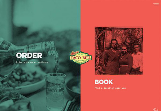 Taco Bill 的網(wǎng)站就是一個(gè)很好的例子,當(dāng)你打開網(wǎng)站的時(shí)候,設(shè)計(jì)師就為用戶提出了兩個(gè)問題:你是想打包帶走事物,還是預(yù)訂之后在餐廳里吃?通過分屏的方式,用戶有了兩個(gè)不同的選擇。分屏式的設(shè)計(jì)讓用戶的選擇更加直觀、可視化。