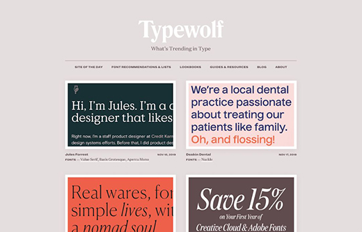 作為備受歡迎的排版趨勢網(wǎng)站,Typewolf仍舊使用復(fù)古的排版和顏色來設(shè)計(jì)其網(wǎng)站頁面,同時仍保持美學(xué)的現(xiàn)代性。他們的字體與背景顏色搭配,視覺上很復(fù)古,但卻絲毫不讓人覺得過時。