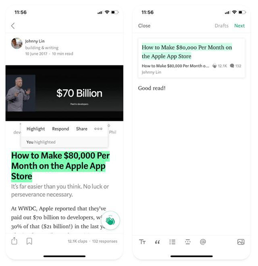 設(shè)計(jì)師熟悉的medium官方App設(shè)計(jì),在正文閱讀時(shí),同樣采用不同的視覺重點(diǎn)來突出重要信息,比如左邊通過字重以及文字背景綠色底色和正文對(duì)比,非常醒目,右側(cè)通過淺綠色作為背景強(qiáng)調(diào)突出。